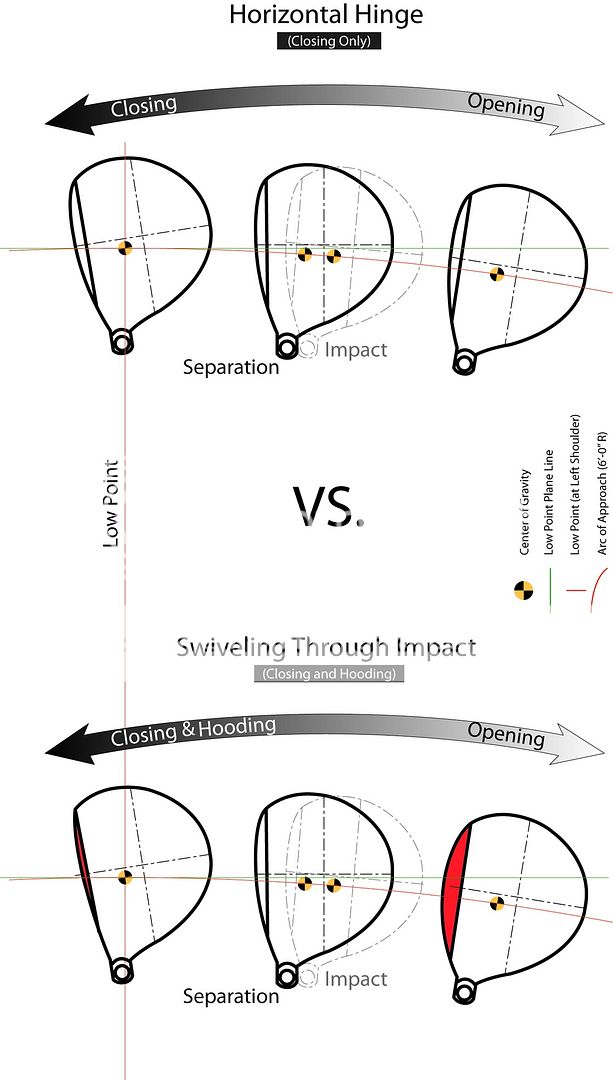The difference between Horizontal Hinging and Swivel Impact is illustrated below. With Horizontal Hinging, the Left Wrist remains Vertical to the Horizontal Plane through the Impact Interval. With "Swivel Impact", the Left Wrist continues Rolling counterclockwise through Impact. Swiveling through Impact Closes and Hoods the Clubface, while Horizontal Hinging through Impact Closes the Clubface Only.