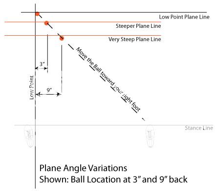 Of course, all of this assumes that you're using the "Right Forearm Angle of Approach" and not using a Hand Swivel at Impact. Also, when Homer said to move the Ball toward your right foot, he was giving a fast way to locate the plane angle. This should work for most people but its only a guideline. The right forearm angle of approach will give you the exact location each time but I find moving it back toward your right foot a pretty good quick method substitute.