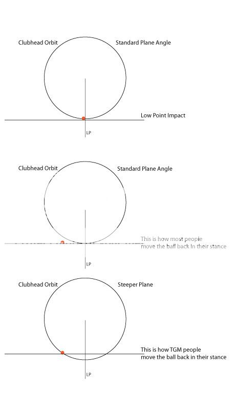 If you want to hit a straight shot with a ball played 6 inches aft of Low Point, then steepen the plane. The ball is moved back on the orbit (not on the plane line). Moving it back on orbit will raise the ball above ground, so steepen the plane from the Plane reference point on your body (shoulder or hip). Then, you're not changing Low Point Location but you are substantially reducing the Clubheads Angle of Approach. Homer said 'move the ball back toward your right foot (see illustration #3 and #4). When you move the ball back on the plane line you're creating additional divergence and you need to pivot or align differently or swing cross line to intersect the ball, illustration #2.