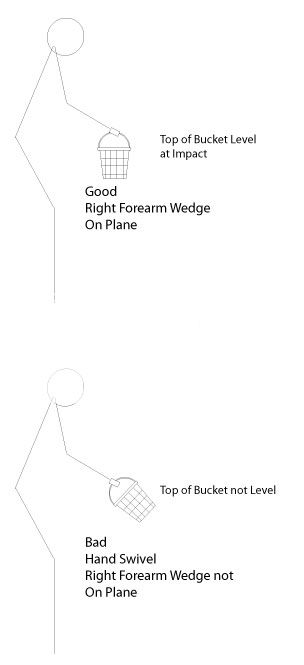 After you've learned to do the above, then also place your left hand on the bucket handle. Now watch as you move your right forearm so the bucket is near your left foot, that the left hand "Rolls" (the back of the flat left wrist is facing the target). The Flat Left Wrist was facing the plane line and is now facing the Target.